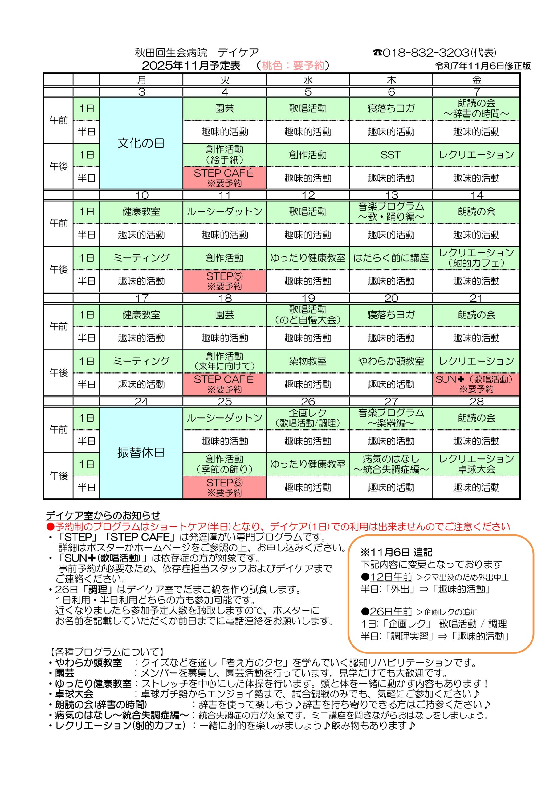 ●11/26 午前 ▷企画レクの追加1日利用 「企画レク」 歌唱活動 / 調理半日利用「調理実習」→ 「趣味的活動」に変更
